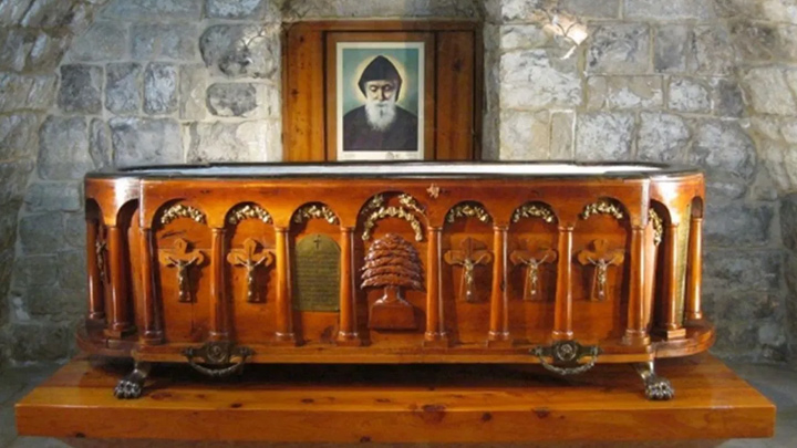 يصّلي رهبان دير مار مارون- عنّايا عند التّاسعة مساءً المسبحة الورديّة، من أمام ضريح القدّيس شربل.