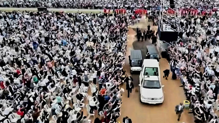 هناك استقلّ الباباموبيلي، ومعه البطريرك المارونيّ الكاردينال مار بشارة بطرس الرّاعي، واخترق الحشود نحو المذبح، على وقع التّرانيم وسط هتافات الشّعب للآتي بإسم الرّبّ من أجل زرع السّلام فيما بينهم.
