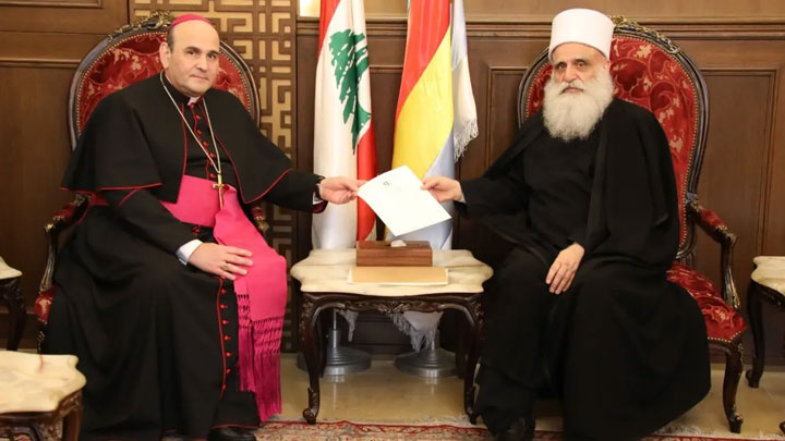 سلّم السّفير البابويّ في لبنان المونسنيور باولو بورجيا، إلى كلّ من مفتي الجمهوريّة اللّبنانيّة الشّيخ عبد اللّطيف دريان في دار الفتوى، وشيخ العقل لطائفة الموحّدين الدّروز الدّكتور سامي أبي المنى في دار الطّائفة بفردان، رسالة من البابا لاون الرّابع عشر.